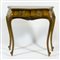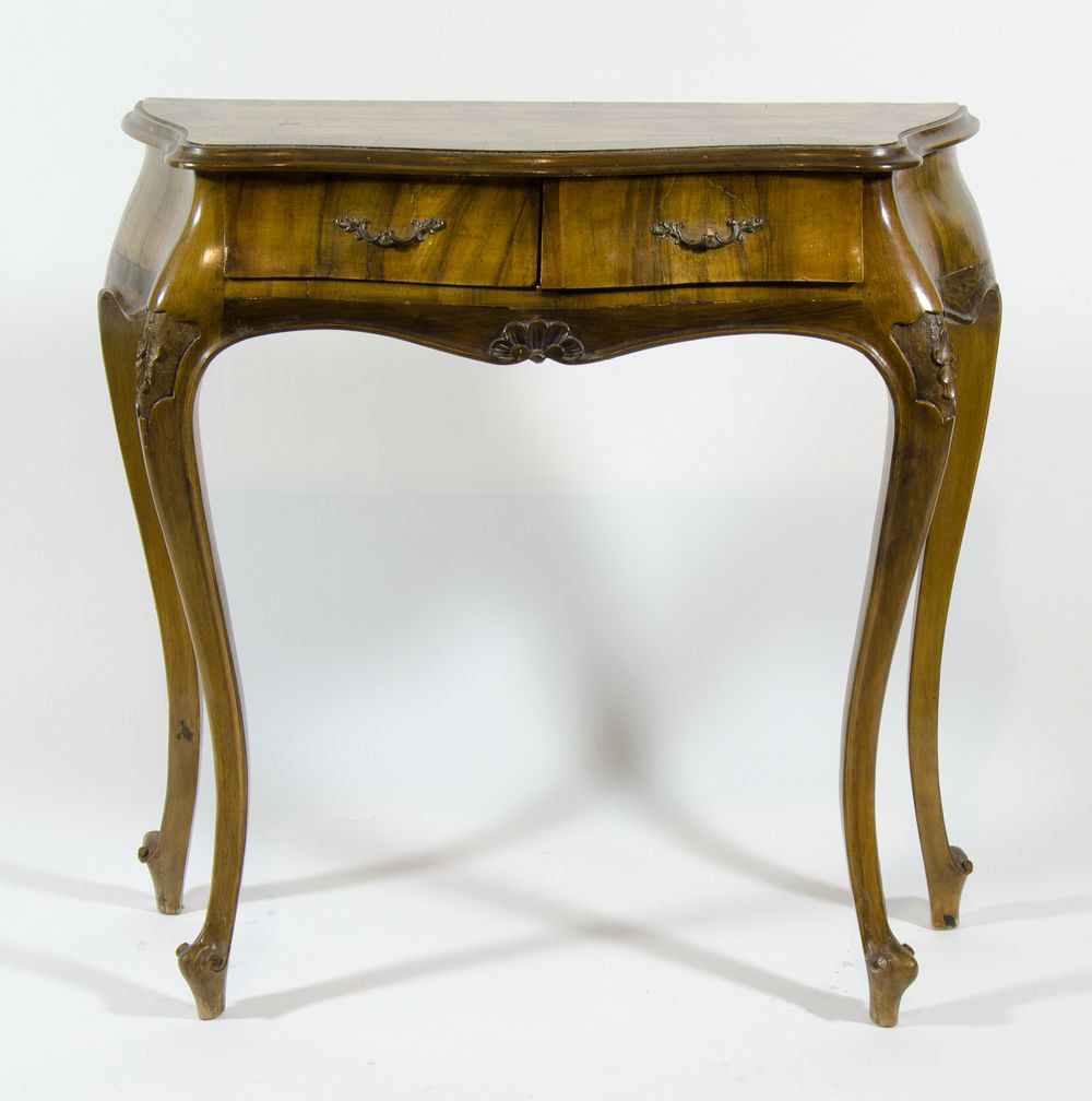 Consolle in legno con piano sagomato a 2 cassetti, su alte gambe mosse.