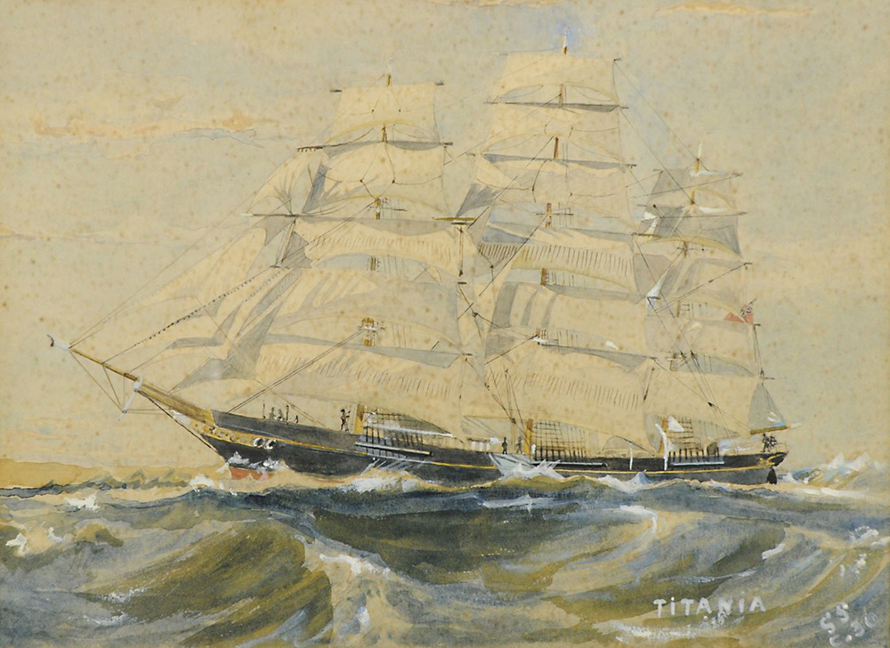 Pittore dell'800 "Titania, veliero a tre alberi" cm. 20x28 - acquerello su carta