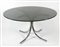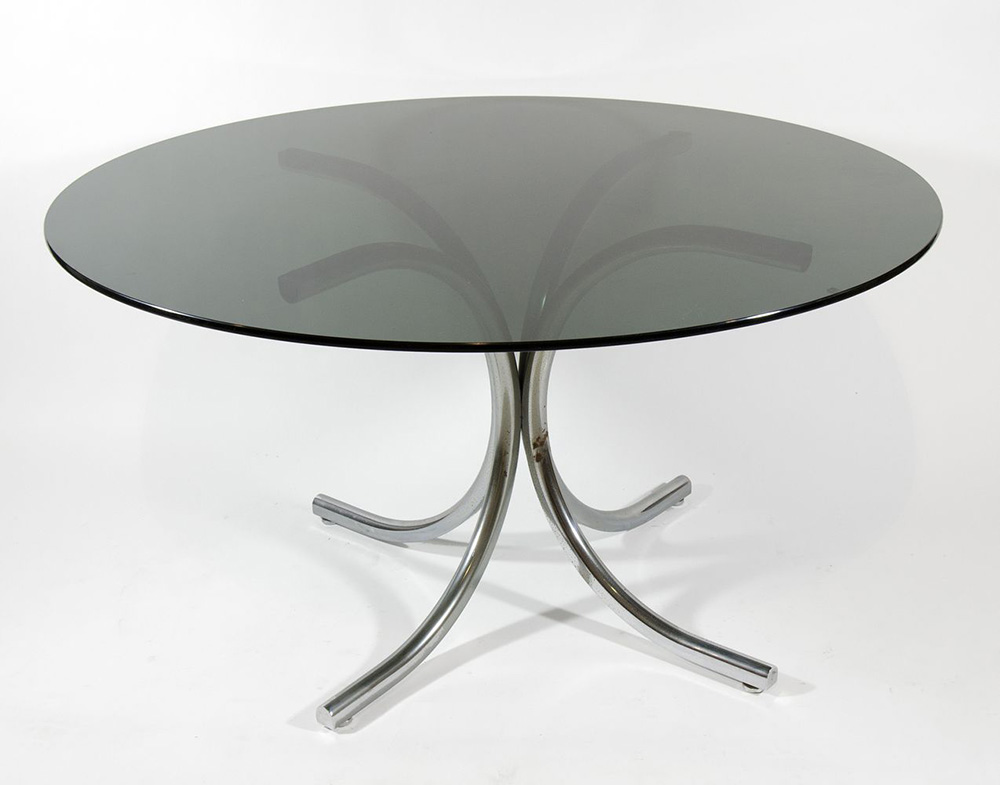 Tavolo rotondo con piano in cristallo fumè, base cromata. H. cm. 71, diam. cm. 130.