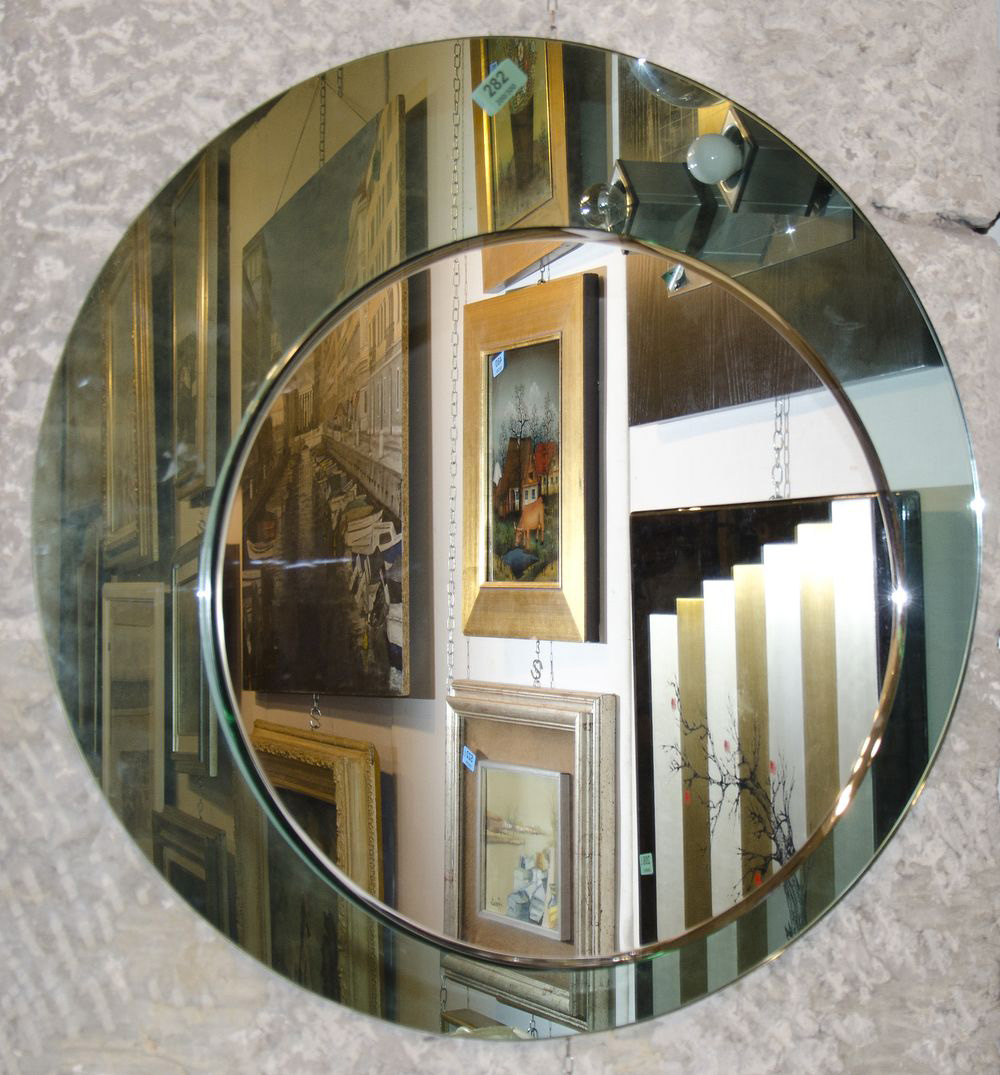Specchio rotondo nel quale è inserito un altro specchio più piccolo. Diam. tot cm. 70.