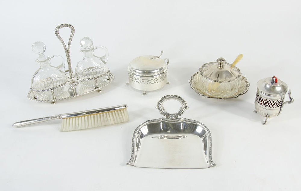 Lotto 283 | Lotto di vari oggetti in argento tra cui oliera e cestino. Gr. Tot 900.