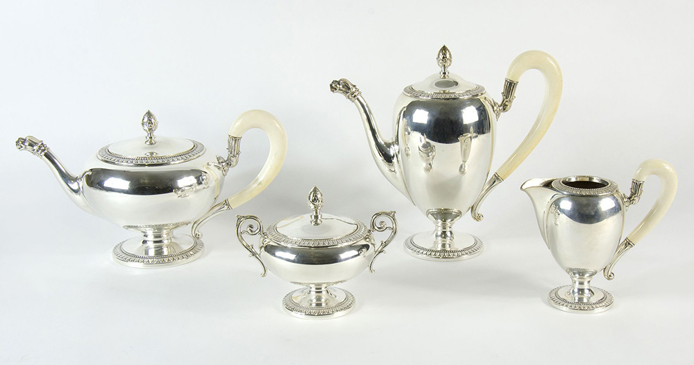 Lotto 294 | Servizio in argento lavorato a palmette e manici in avorio composto da 4...