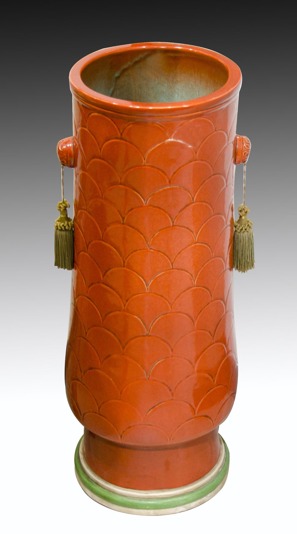 Portaombrelli in ceramica rossa lavorata a mezzelune. Marcato LS sotto la base. (difetto).