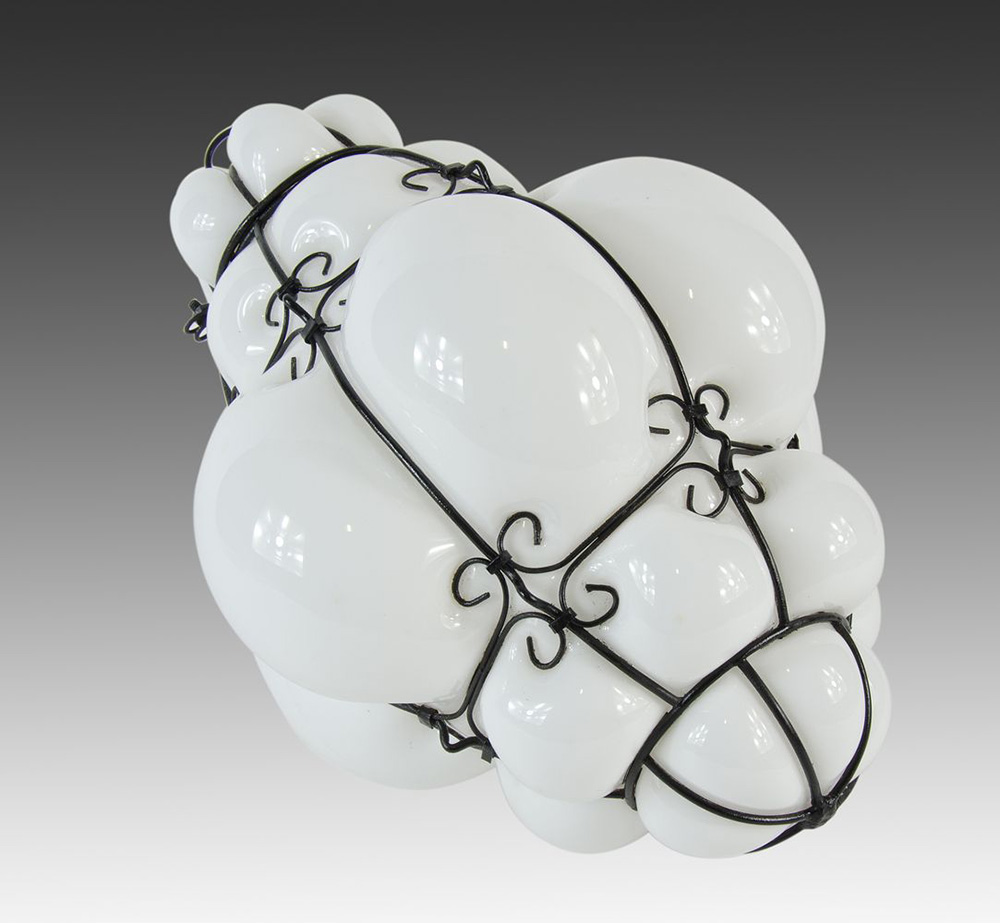 Lampada a sospensione in vetro lattimo con montatura in ferro.