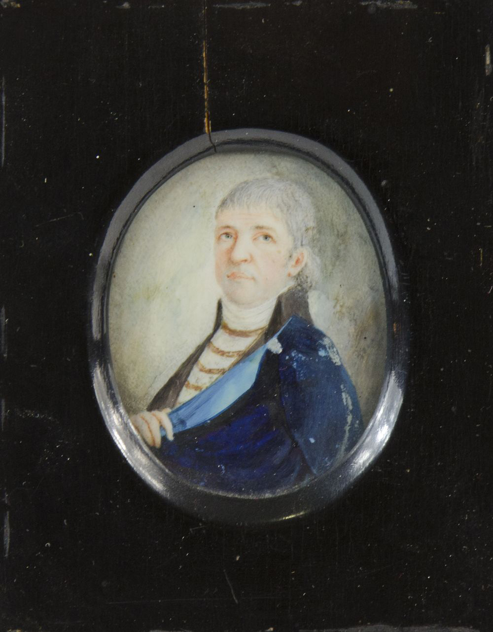 Miniatura dipinta raffigurante gentiluomo, entro cornice in legno nero.