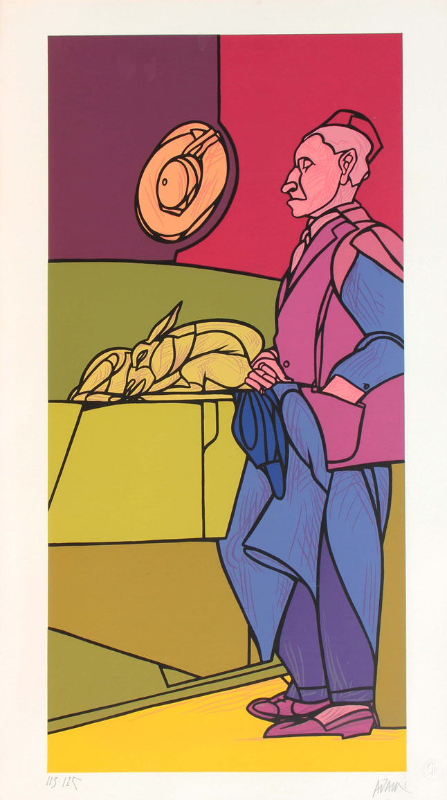 Valerio ADAMI Bologna 1935 Senza titolo serigrafia a colori colour serigraphy cm 100×55 Edizione di 125 esemplari. Edition of 125. Timbro Galleria Poleschi Arte, Lucca, firma ‘Adami’ (in basso a destra) Stamp of the Galleria Poleschi Arte, Lucca, signed ‘Adami’ (lower right) Base d’asta