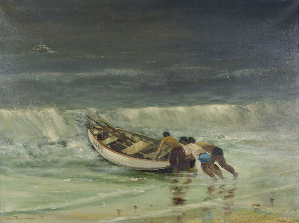 Erich Demmin 1911-1997 "Pescatori in partenza" cm. 60x80 - olio su tela Firmato b. a s.