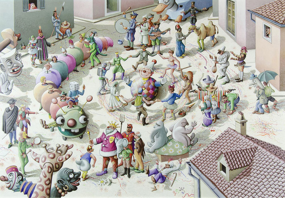 Giovanni Duiz 1923-2013 "Giochi di fanciulli" cm. 60x85 - olio su tavola Firmato alto a d. e datato '03. Al retro titolo e indirizzo dell'Artista.