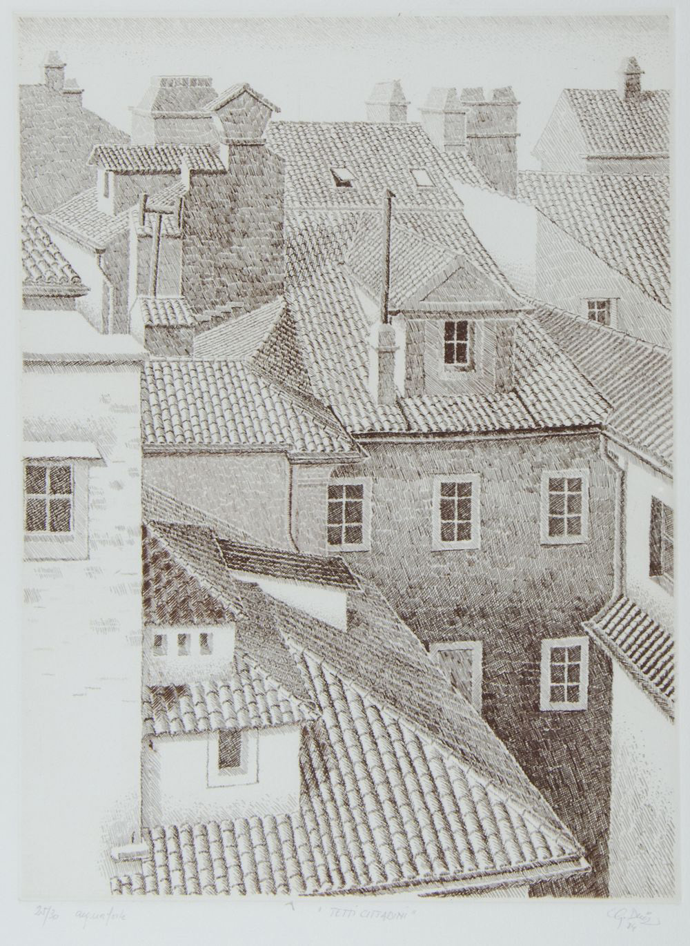 Giovanni Duiz Trieste 1923-2013 "Tetti cittadini" cm. 60x45 - acquaforte Firmato b. a d. e datato '84. Esemplare 25/30.