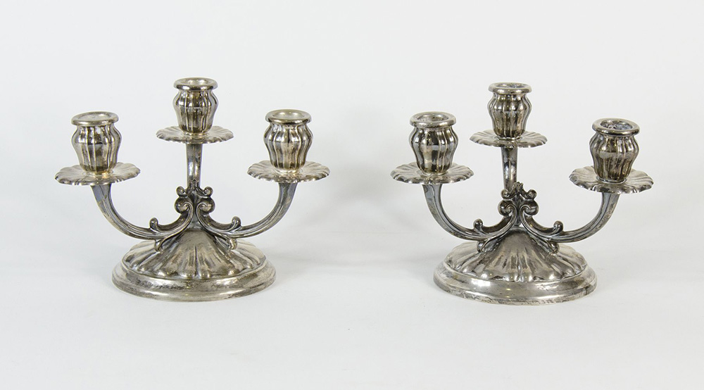 Paio di candelabri in a argento a 3 fiamme. H. cm. 15,5. Gr. Tot 1000.