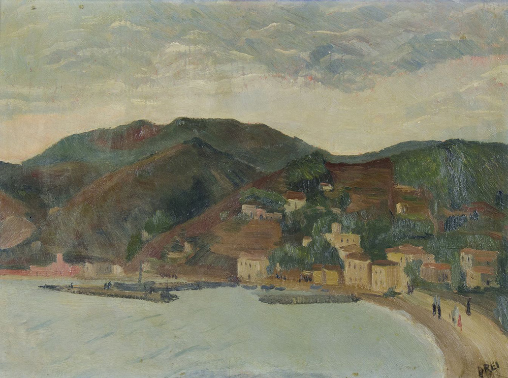 Ercole Drei 1886-1973 "Paesaggio" cm. 37x50 - olio su tavoletta Firmato b. a d. Al reteo etichetta Mostra Nazionale del Paesaggio Marine d'Italia.