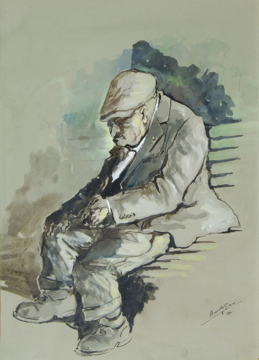 Eco Aniello 1919-2000 "Sulla panchina al parco" cm. 50x35 - acquerello su carta Firmato b. a d. e datato 1970.