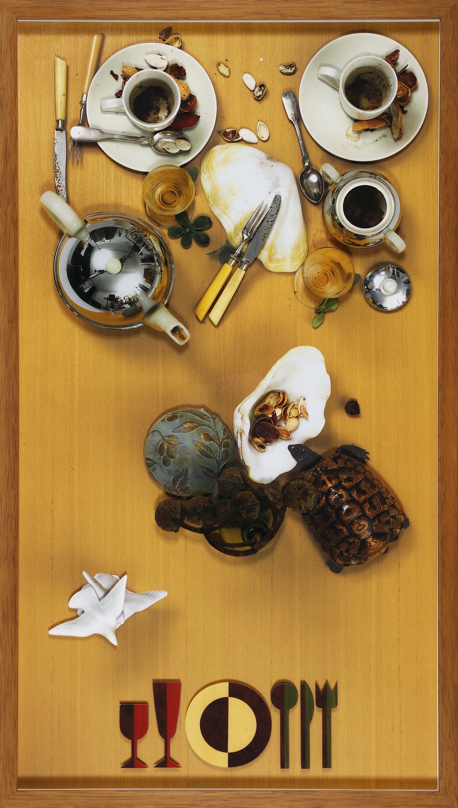 SPOERRI DANIEL (n. 1930) Die Hungrige Schildkrote. . Multiplo tridimensionale. Cm 56,00 x 103,00. E.A. Al retro firma, tiratura e cartiglio della Galerie F-GmbH, Kranenburg. . Cornice presente