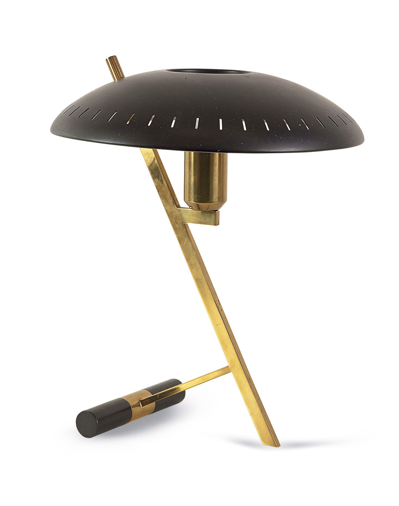KALFF LOUIS CHRISTIAN - Lampada da tavolo. Ottone e metallo smaltato nero, Prod. Philips, 1955. Etichetta e marchio inciso del produttore. H cm. 40. Bibl.: C. e P. Fiell, "1000 Lights", vol. I, Taschen, 2005, pag. 522.