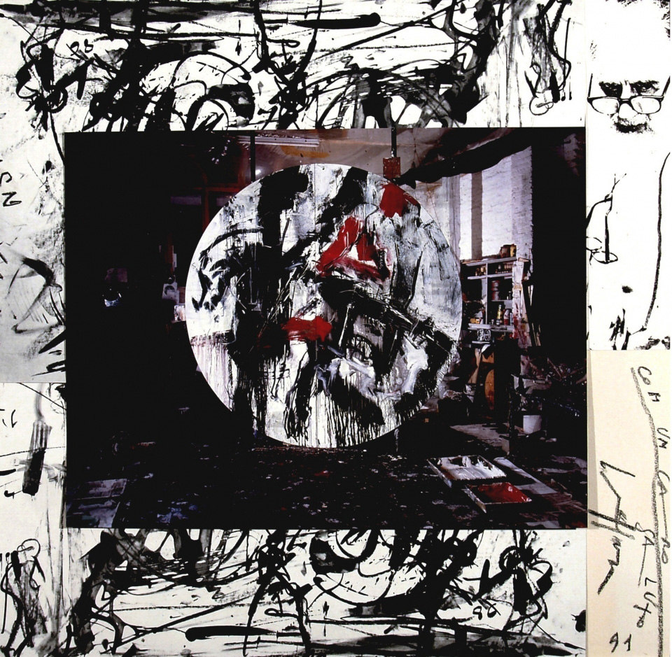 (Polaroid in cui appaiono il Maestro Emilio Vedova e Carlo Scalea nella sua tipografia nel 1991. Luogo in cui il Maestro realizzo l'opera).