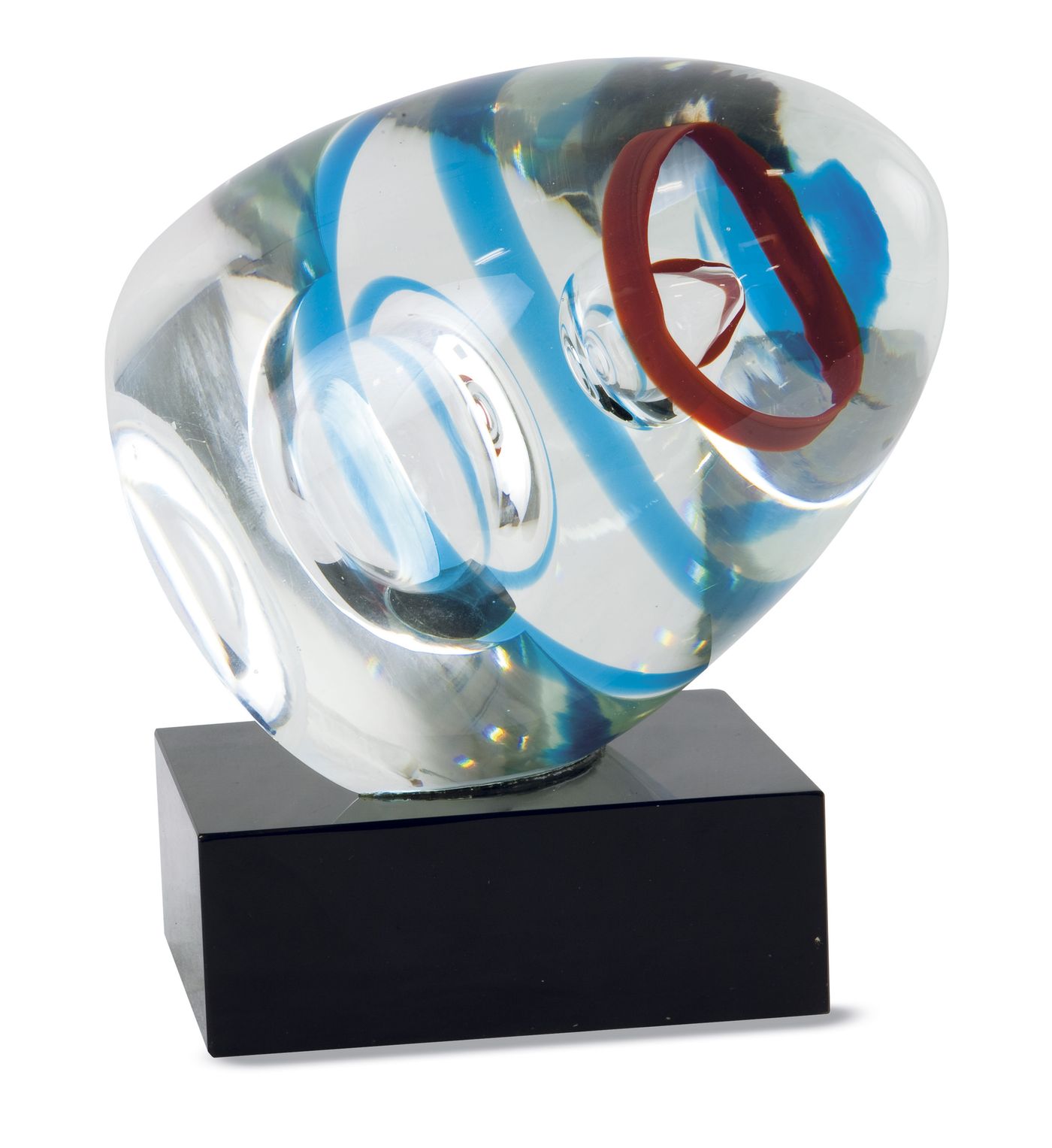 BARBINI ALFREDO (ATTRIBUITO) - Scultura in vetro massello. Bolle controllate e anelli colorati sommersi. Base applicata a freddo in pasta vitrea nera. H cm 23