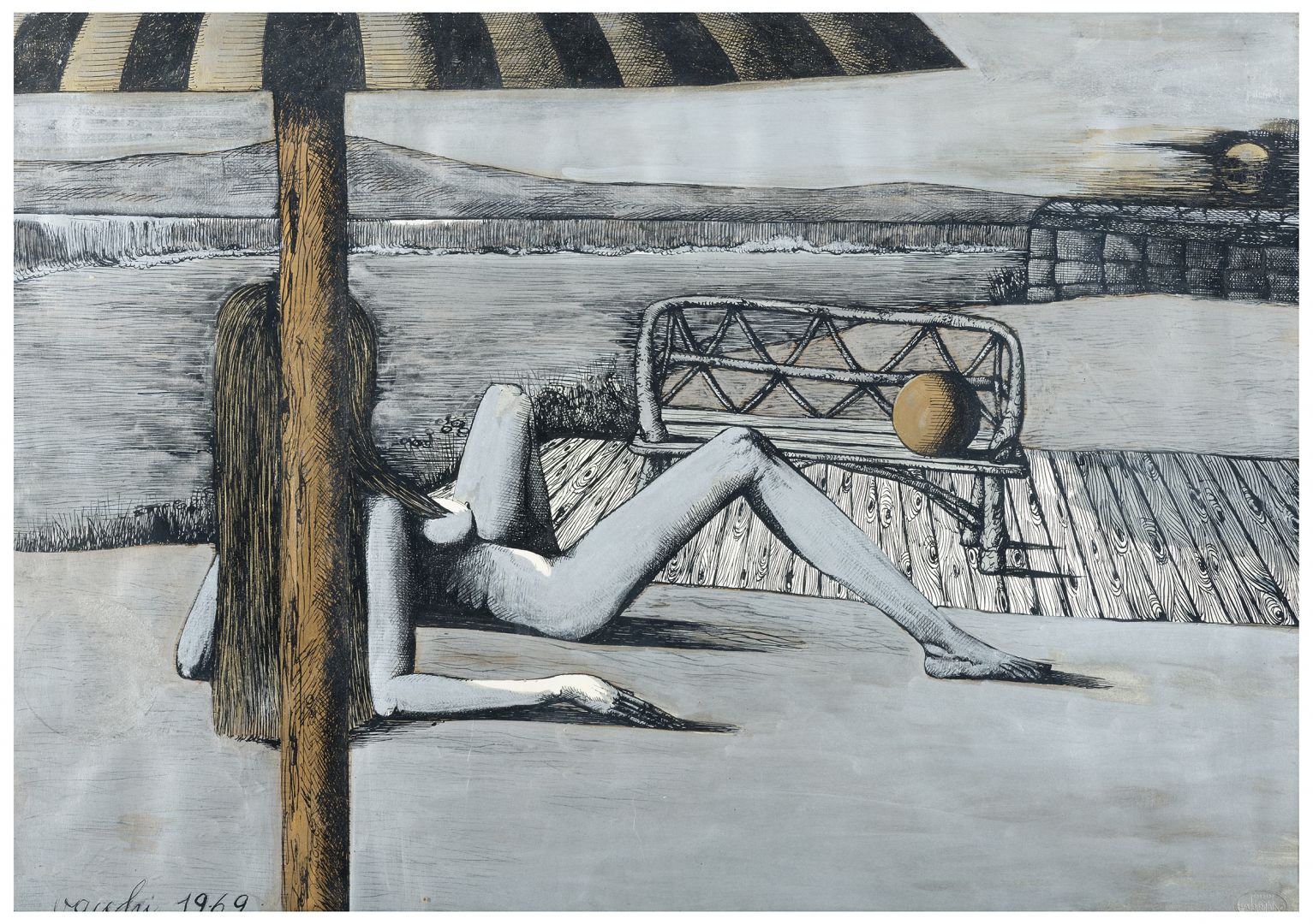Figura donna sdraiata sulla spiaggia 1969