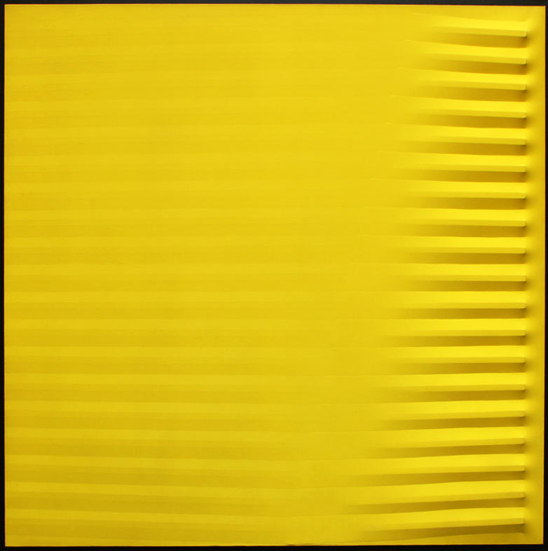 Agostino BONALUMI Vimercate (MI) 1935 Giallo, 1981 tela estroflessa e tempera vinilica structured canvas and vinyl tempera cm 140×140 Autentica dell’Archivio Bonalumi su fotografia Certificate of Archivio Bonalumi Provenienza | Provenance VAF - Stinftung Collection, Frankfur Museum Bochum Collection, Bochum Bibliografia | Bibliography ‘Agostino Bonalumi - Malerei in der dritten Dimension’, Institut Mathildenhohe, Darmstadt, 21 settembre 2003 - 18 gennaio 2004, p. 243 L.M. Barbero, ‘Bonalumi, evoluzione continua tra pittura e ambiente’, Galleria d’arte Niccoli, 2000, p. 105 Firma, data ‘Bonalumi, 81’ (al retro) Signed, dated ‘Bonalumi, 81’ (on the reverse)