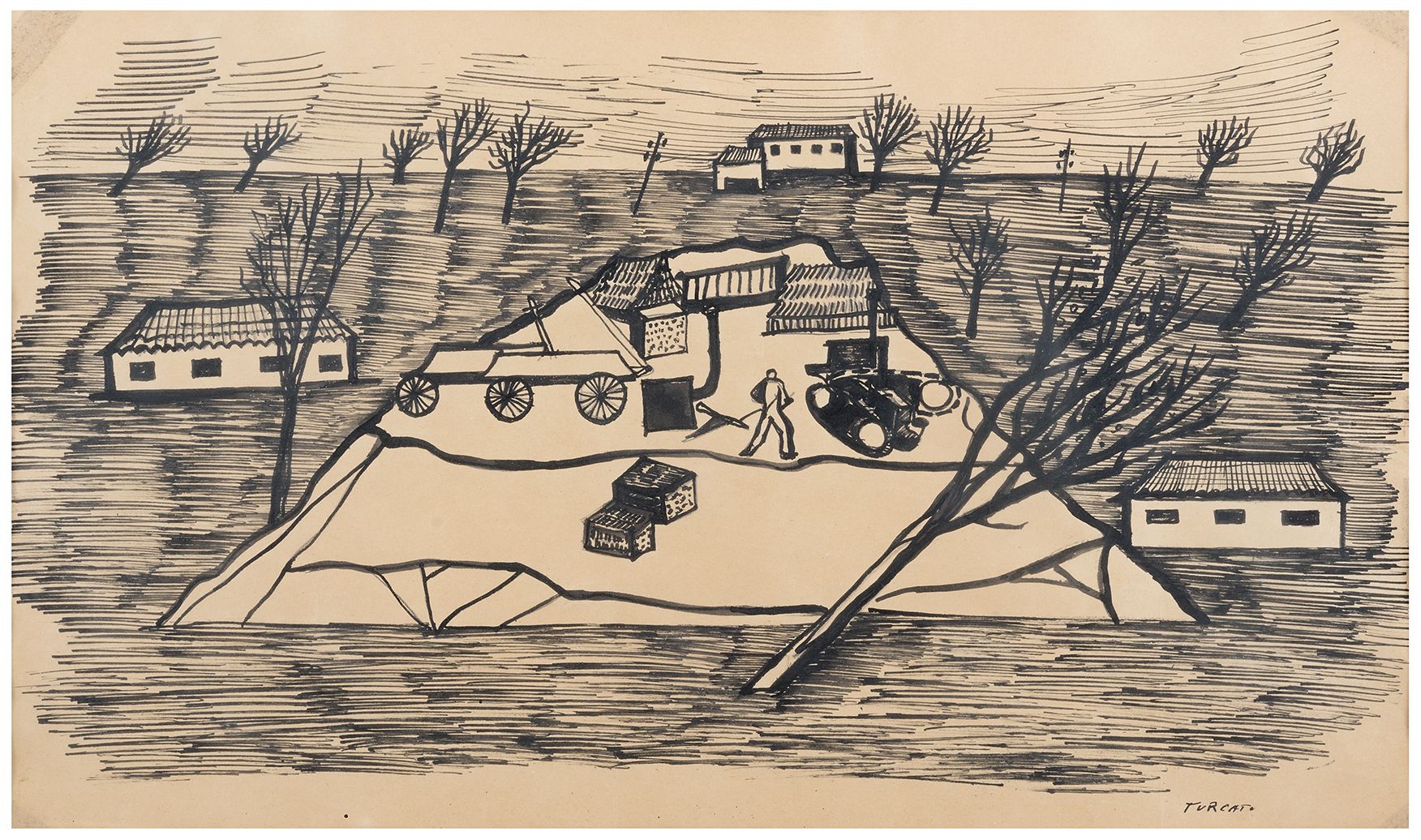 Lotto 175 | GIULIO TURCATO Mantova 1912 - Roma 1995 Paesaggio di campi con trattori 1940...