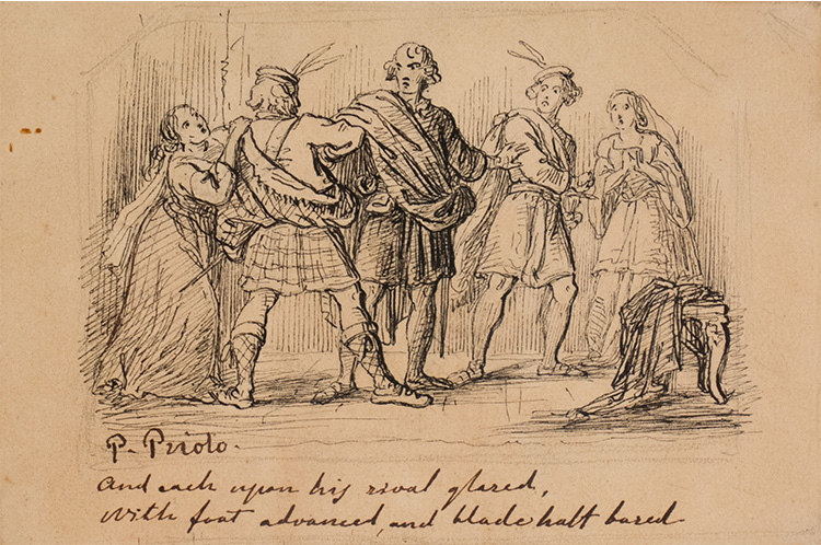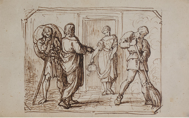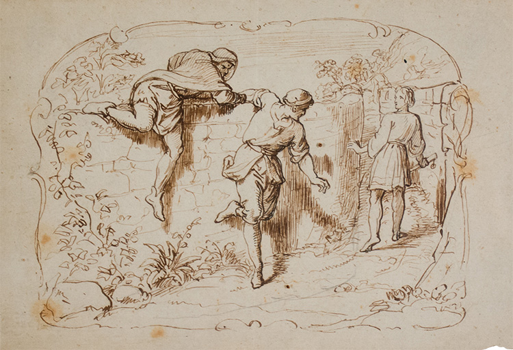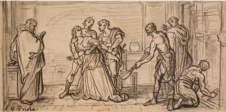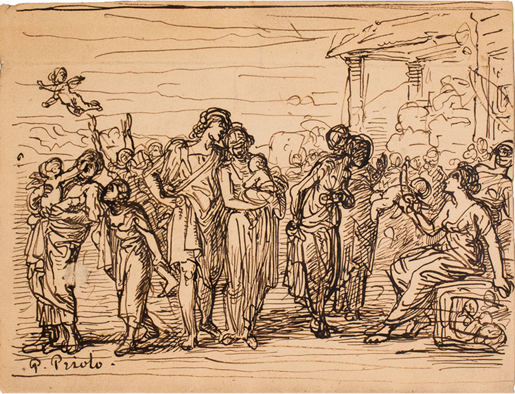 Francesco Paolo Priolo Sei disegni raffiguranti: A "Vocazione di San Matteo"; B "Mercato degli amorini"; C "Scena di genere"; D "Martirio di Sant'Agata"; E "Scena galante"; F "Giovane sorpreso per la strada da due briganti". XIX sec. A: inchiostro acquerellato su carta, 13 x 16,5 cm, iscritto in basso a sinistra "P. Priolo"; B: inchiostro su carta, 11,5 x 15 cm, iscritto in basso a sinistra "P. Priolo"; C: inchiostro su carta, 11 x 18 cm, non iscritto; D:inchiostro e matita su carta, 11,5 x 23,5 cm, iscritto in basso a sinistra "P. Priolo"; E: inchiostro su carta, 8,3 x 12,3 cm, iscritto in basso a sinistra "P. Priolo". Nella parte inferiore riportata una frase in inglese; F: inchiostro su carta, 11 x 16,5 cm, non iscritto.
