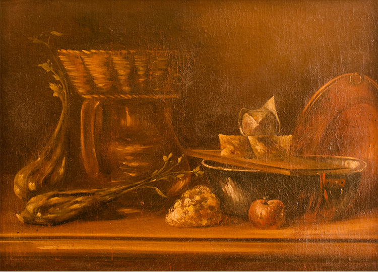 Scuola Italia Centrale Dipinto raffigurante "Natura morta con ortaggi, frutta...