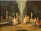 Dipinto raffigurante "Scena galante ambientata all'interno di un giardino" XX sec. Tempera su tavola con tracce di olio; 53 x 68 cm; iscrizione di difficile lettura in basso a destra.