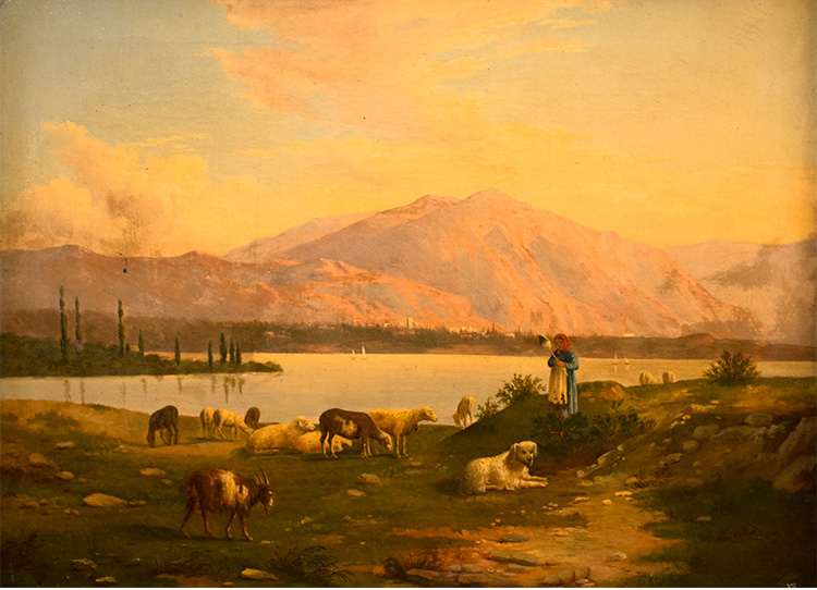 Scuola italiana Dipinto raffigurante "Paesaggio con figura di donna e animali al pascolo" II metà XIX sec. Olio su tela; 54 x 74 cm; sul retro della cornice annotato: "Bonham"