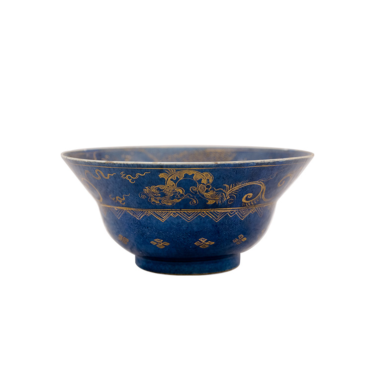 Ciotola in porcellana XX sec. Porcellana blu dipinta a mano con decorazioni in oro; 8,5 x 19 cm.