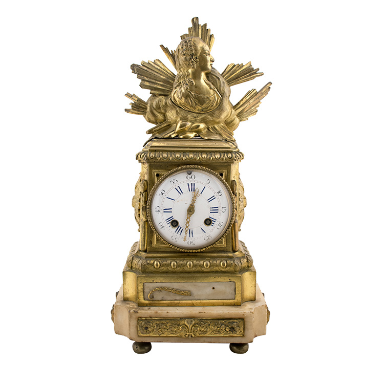 Orologio da tavolo XIX sec.-XX sec. Bronzo dorato con profilo femminile nella parte superiore; 38 x 13 x 18 cm.