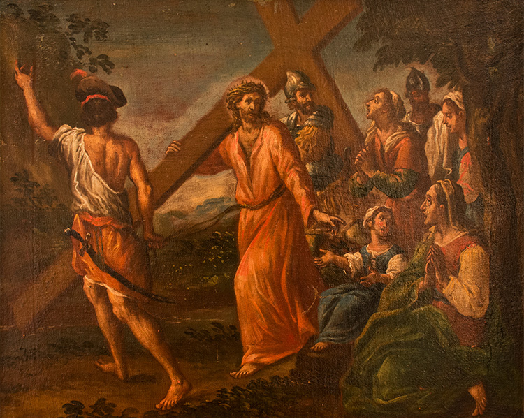 Scuola italiana Dipinto raffigurante "Salita al calvario" II metà XVII sec. Olio su tela; 43 x 53,5 cm.