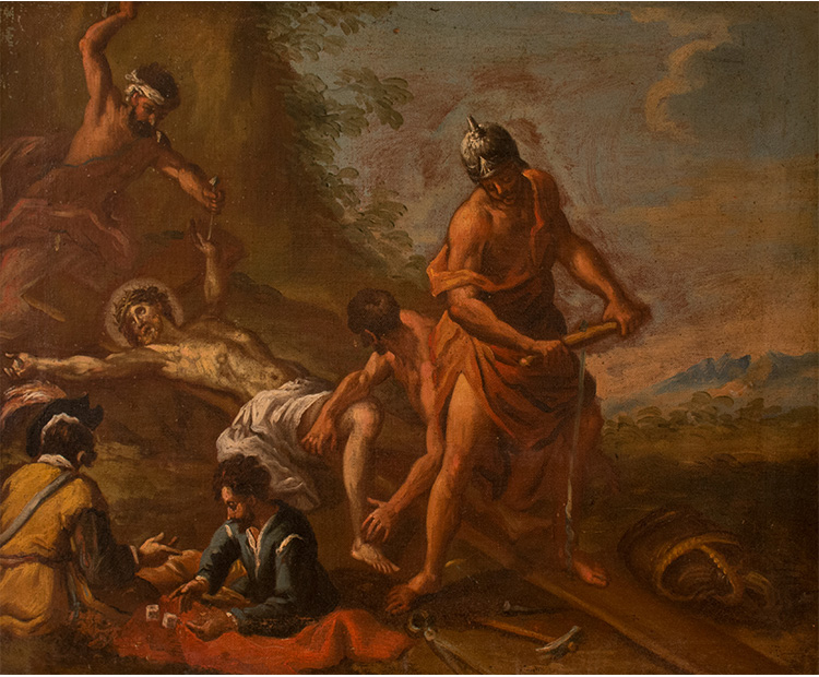 Scuola italiana Dipinto raffigurante "Crocifissione" fine XVII-inizi XVIII sec. Olio su tela; 43,5 x 54 cm.