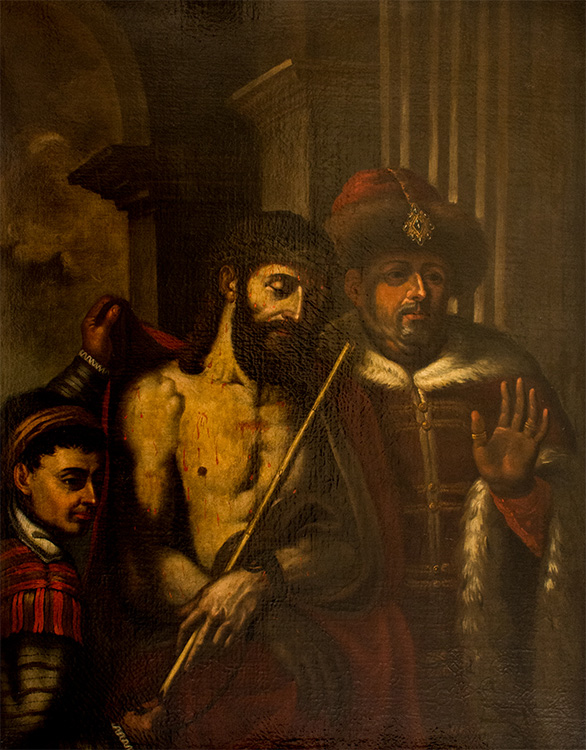 Maestro anonimo Dipinto raffigurante "Incoronazione di spine" XVII sec. Olio su tela, 129 x 102 cm, copia da Tiziano Vecellio