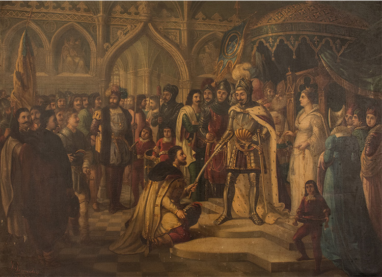 Joanides Dipinto raffigurante "Scena di investitura" XIX sec. (1877) Olio su...