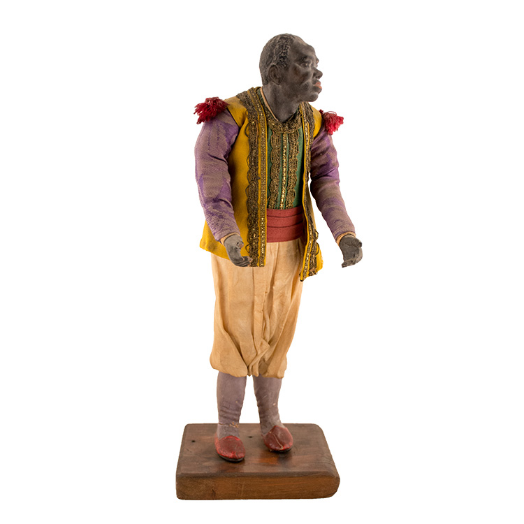 Sette figure stanti di popolani in abiti tradizionali. A figura maschile stante di moro; B figura maschile stante di moro; C figura di popolana con cesto di vimini; D figura di popolana con cesto di vimini; E figura di popolana con cesto di vimini; F figura maschile stante; G figura maschile stante fine XIX-inizi XX sec. A: h 32 cm; B: h 34 cm; C: h 31,5 cm; D: h 29,5 cm; E: h 31,5 cm; F: h 33 cm; G: h 30 cm. Nel rivestimento interno degli indumenti presenti brani in latino ed in italiano. Stato conservativo non ottimale.