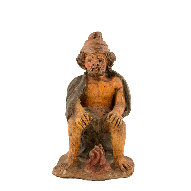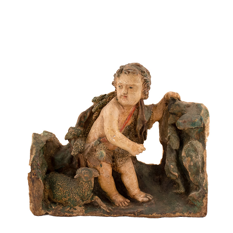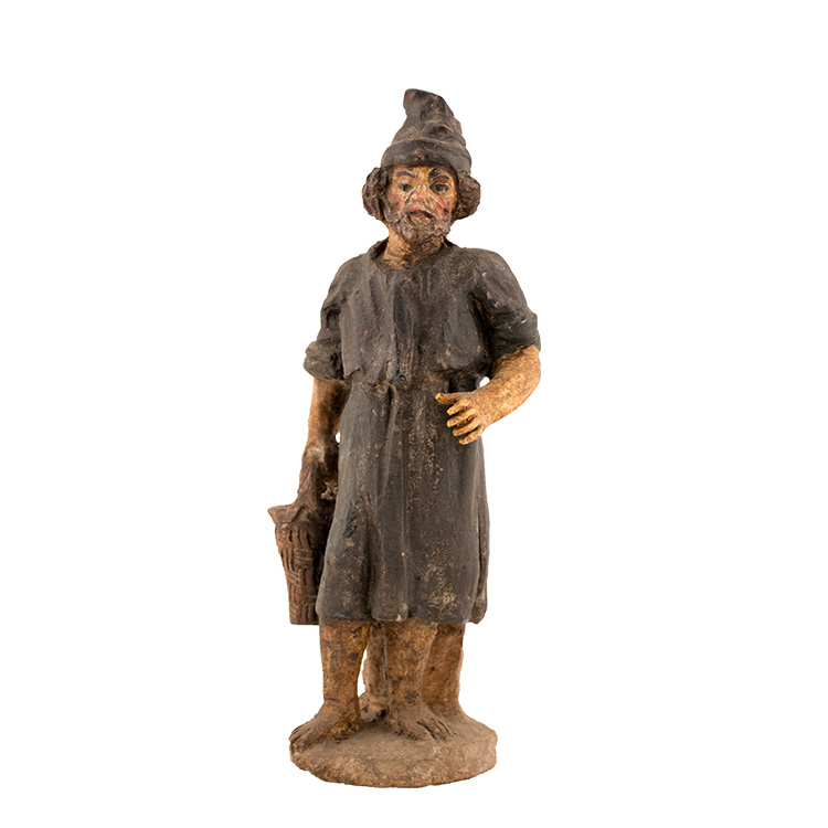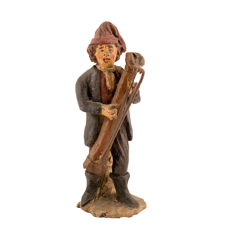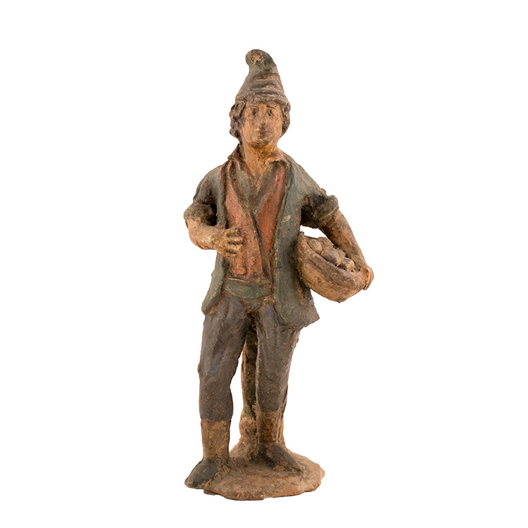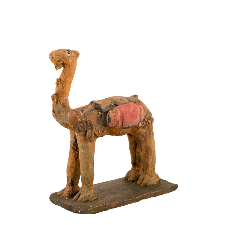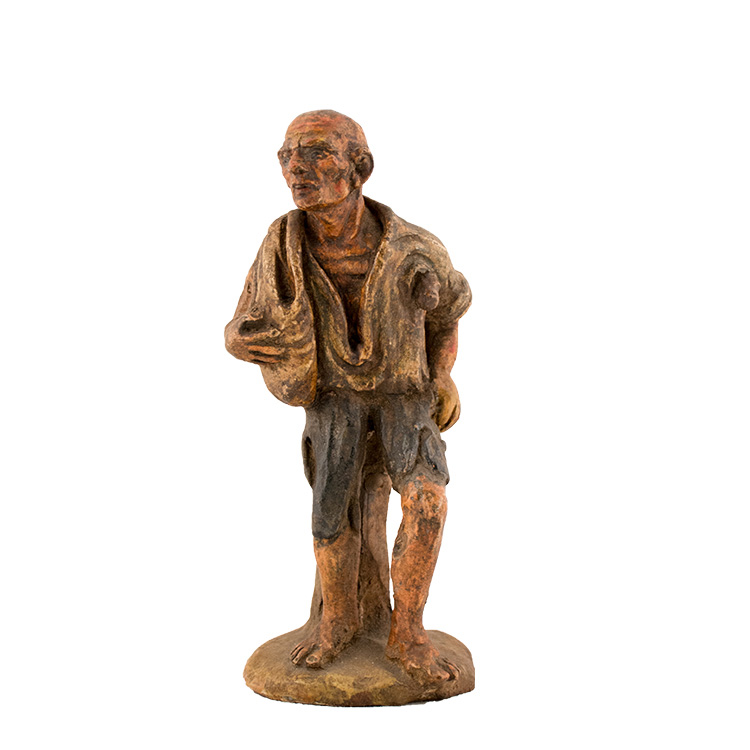 Dieci figure stanti di presepe. A Figura maschile di zampognaro; B Figura maschile di suonatore di arpa; C Figura stante di pastore calvo; D Figura stante di pastore con cesto; E Figura stante di pastore con cesto di frutta; F Figura maschile di soldato stante; G Figura maschile di pastore seduto con fuoco; H: Figura di dromedario; I Figura di dromedario; L Figura di fanciullo e agnellino (San Giovanni Battista) inizi XX sec. Figure in terracotta dipinta a mano. A: h 21 cm; B: h 19 cm; C: h 18 cm; D: h 21,5 cm; E: h 21 cm; F: h 21 cm; G: h 14 cm; H: 16 x 13 x 6,7 cm; I: 15 x 12,5 x 6,5 cm; L: 12,5 x 14,5 x 3,5 cm.