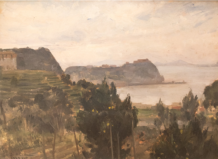 Lolli Dipinto raffigurante "Paesaggio" XIX sec. tecniche miste su tavola; 30 x 40 cm; firmato in basso a sinistra: "Lolli 1939 XVIII"