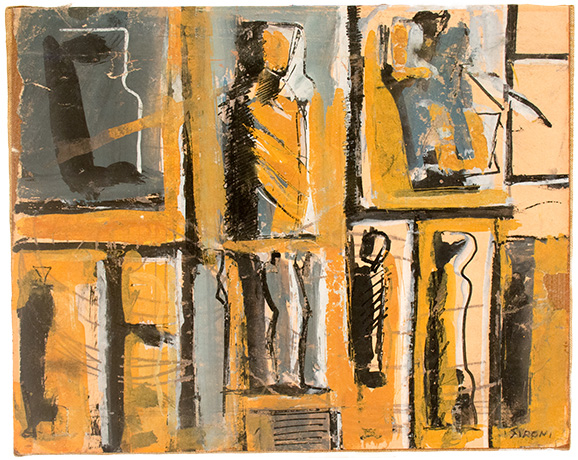 M. Sironi "Composizione" 1950 ca. Tempera, china e matita grassa su carta [applicata su tela], 20, 8 x 2, 61 cm; Firma apocrifa “SIRONI”, in basso a destra; Opera archiviata dall’Associazione per il Patrocinio e la Promozione della Figura e dell’Opera di Mario Sironi, Milano, con il numero 65/17 RA. Nel 1949-1950, Sironi aderisce al progetto della importante collezione Verzocchi, sul tema del lavoro, inviando, oltre ad un autoritratto, l'opera intitolata appunto Il lavoro. Continua a esporre in Italia (Triennale di Milano, 1951; Quadriennale di Roma, 1955) e all'estero (mostra itinerante negli Stati Uniti, con Marino Marini, nel 1953). Esegue inoltre scenografie e costumi per il teatro (Tristano e Isotta, 1947, per la Scala di Milano; I Lombardi alla Prima Crociata, 1948, e Don Carlos, 1950, per il Teatro Comunale di Firenze; Medea e Il Ciclope, 1949, per il Teatro Romano di Ostia). Nel 1955 esce la monografia, tuttora fondamentale, Mario Sironi pittore di Agnoldomenico Pica. Nel 1956 è eletto Accademico di San Luca.