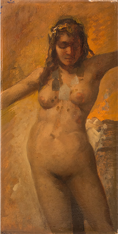 Maestro d'ambito italiano "Dipinto raffigurante Figura di bagnante" II metà XIX sec. Olio su tela; 35,8 x 17,8 cm; pittura in stile orientalista.