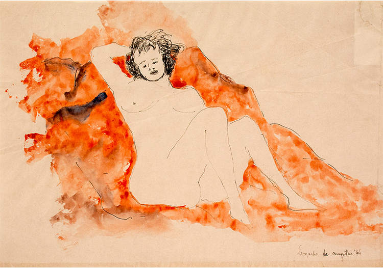 Leonardo de Magistris Disegno raffigurante "Nudo di donna disteso" 1964 Penna con elementi ad acquerello; 24,5 x 35 cm; firmato in basso a destra "Leonardo de Magistris '64."