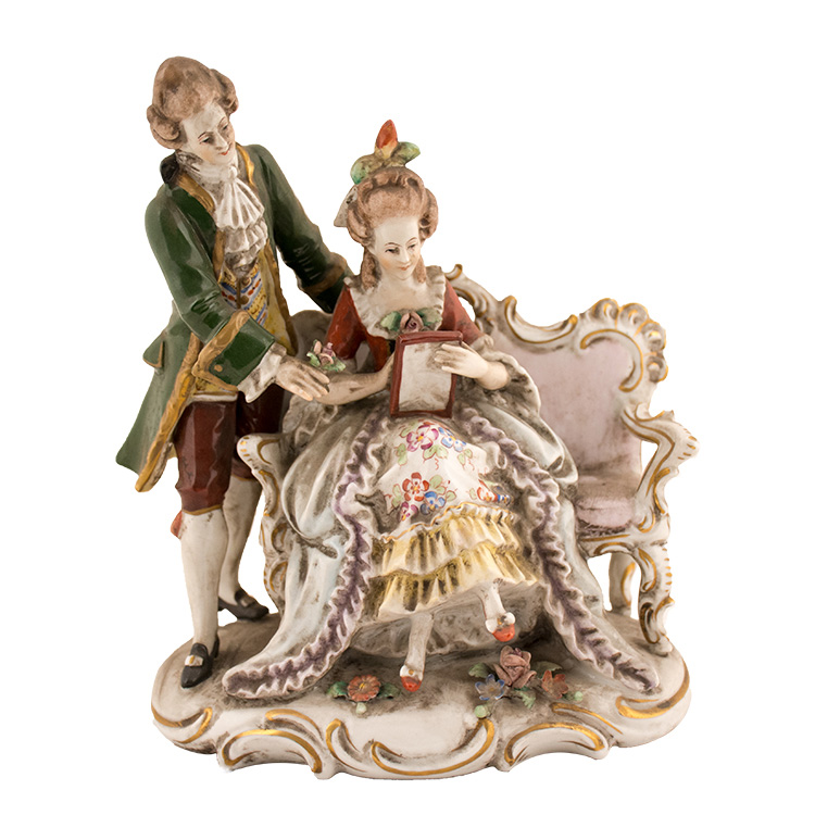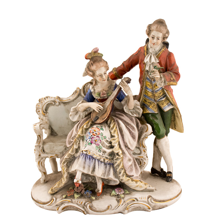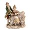 Coppia di porcellane. A Scena galante con coppia in abiti settecenteschi seduta su divano; B Scena di corteggiamento con coppia in abiti settecenteschi seduta su divano. XIX sec. Coppia di statuine in porcellana manifattura Capodimonte. A: 19 x 15,5 x 9,5 cm; B: 19 x 16 x 10 cm.