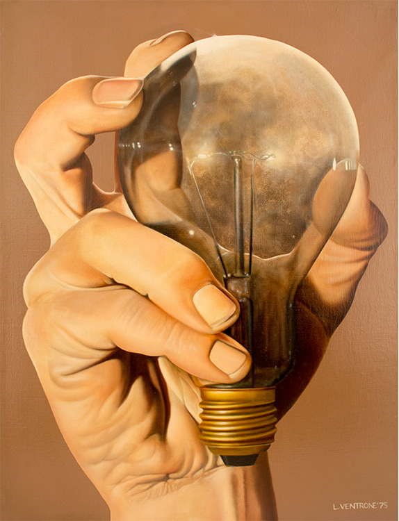 L. Ventrone Il giorno che afferrai la luce XX sec. (1975) Olio su tela; firmato in basso a destra "L. Ventrone 75"; presenti annotazioni sul retro: "L. Ventrone' 75" "Luciano Ventrone Roma""il giorno che afferrai la luce" "n.6"; Ventrone non si considera un pittore realista in senso tradizionale. Dipinge oggetti reali ma, visto l'utilizzo di alcune tecniche particolari gli oggetti da lui raffigurati sono come trasportati in un contesto allo stesso tempo metafisico ed iperealista. Ciò che vediamo in un'opera di Ventrone non è "reale", perchè non è ciò che vedremmo osservando ad occhio nudo, bensì di più. Ventrone ci mostra le cose in veste più completa e più chiaramente di come ci apparirebbero in realtà. (Edward Lucie-Smith).