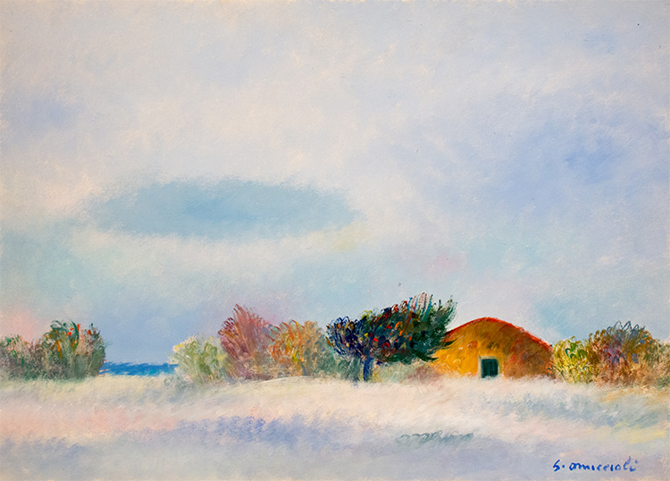 G.Omiccioli Dipinto raffigurante Paesaggio XX sec. Tempera su cartone, 35 x 50 cm, firmato in basso a destra "G. Omiccioli"; sul retro presenti annotazioni: "dipinto e firmato di mia mano G. Omiccioli". Vincitore di un'edizione del Premio Marzotto con Il Pastore con la capretta, Omiccioli è stato presente nelle più importanti rassegne: di particolare rilievo l'invito con un'antologica all'Ermitage di Leningrado, la personale alla Galleria d'Arte La Medusa di Napoli; durante gli anni cinquanta partecipa a collettive a Pittsburg, Boston, Tokio, espone alla mostra itinerante nei paesi scandinavi organizzata dall'Art Club, alle Quadriennali romane del 1955, 1959 e poi del 1966, alle Biennali veneziane del 1952, 1954, 1956. Presenta nel 1959 un dipinto su faesite, Cristo crocifisso, alla VIII Biennale d'Arte Sacra a Bologna. Durante gli anni sessanta espone a tre edizioni della Rassegna di Arti figurative di Roma e del Lazio (1961, 1963, 1965) e alla VI Biennale di Roma del 1968.Nel 1963-64 espone alla mostra Peintures italiennes d'aujourd'hui, organizzata in medio oriente e in nordafrica.