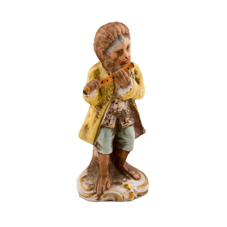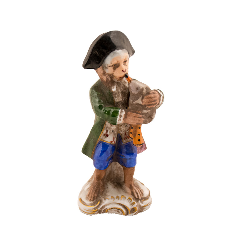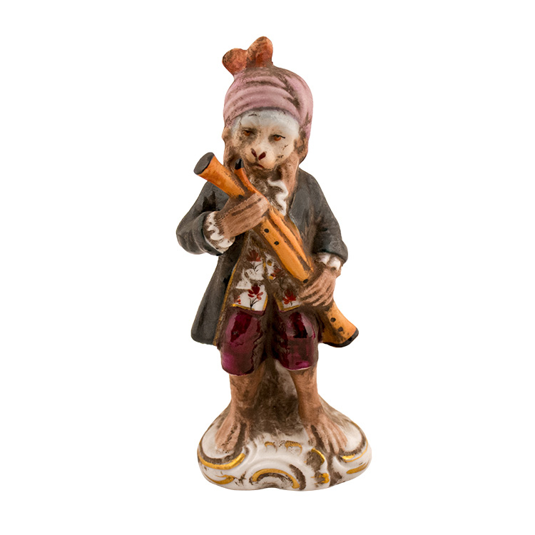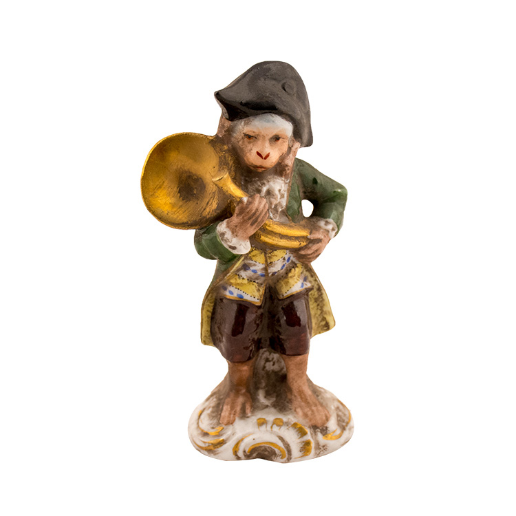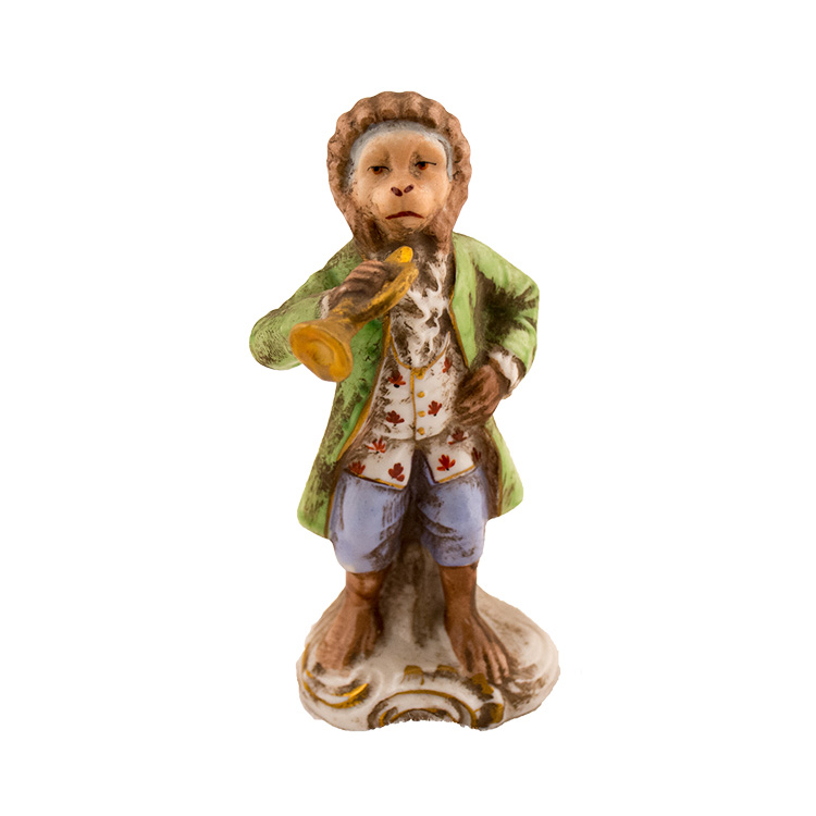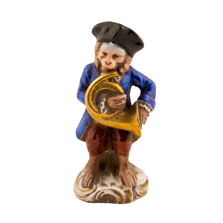 Concerto di scimmie in porcellana composto da 12 pezzi. A: Maestro d'orchestra; B: Violinista; C: Suonatore di violoncello; D: Suonatore di chitarra; E: Musicista con trombetta; F: Flautista; G: Zampognaro; H: Suonatore di corno francese; I: Suonatore con flauto e tamburo; L: Suonatore di trombone; M: Suonatore di fagotto; N: Pifferaio. XIX sec. A: 11,5 x 7,3 x 4 cm; B: 10 x 5,7 x 4 cm; C: 10 x 5 x 3,5 cm; D: 10 x 4,5 x 4 cm; E: 10 x 5 x 4 cm; F: 10 x 4,5 x 3,5 cm; G: 10 x 4 x 4 cm; H: 10 x 4 x 4 cm; I: 10 x 4,5 x 3,5 cm; L: 10,3 x 5,5 x 3,7 cm; M: 10,5 x 4,5 x 3,5 cm; N: 10 x 4 x 4 cm.