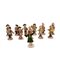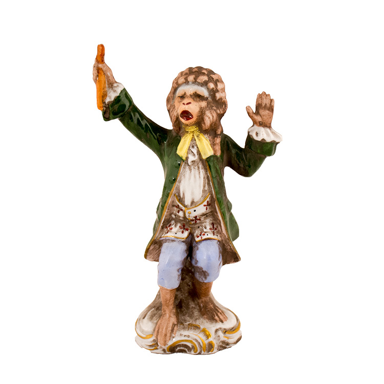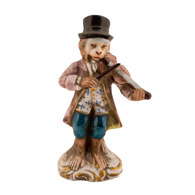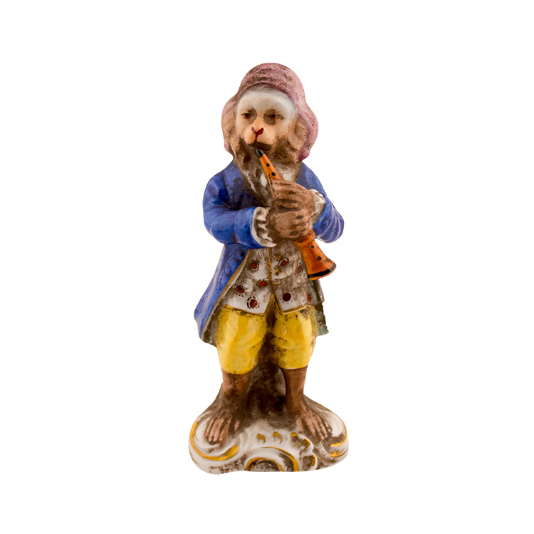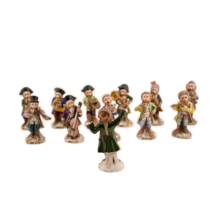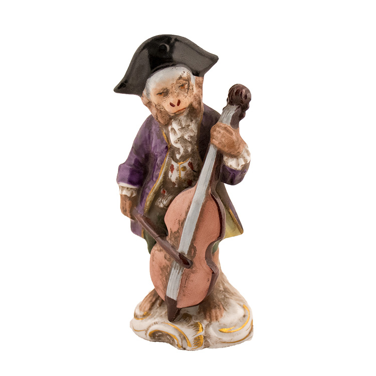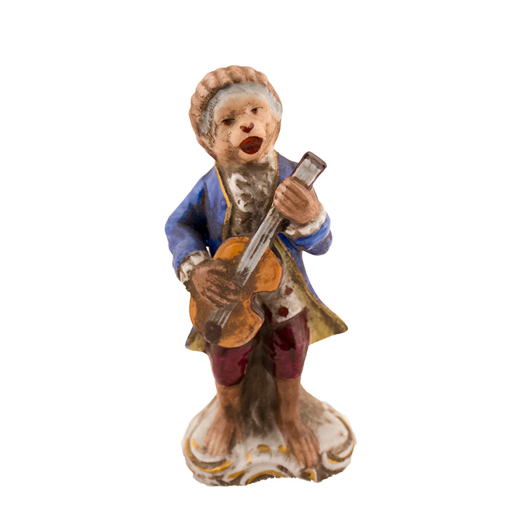 Concerto di scimmie in porcellana composto da 12 pezzi. A: Maestro d'orchestra; B: Violinista; C: Suonatore di violoncello; D: Suonatore di chitarra; E: Musicista con trombetta; F: Flautista; G: Zampognaro; H: Suonatore di corno francese; I: Suonatore con flauto e tamburo; L: Suonatore di trombone; M: Suonatore di fagotto; N: Pifferaio. XIX sec. A: 11,5 x 7,3 x 4 cm; B: 10 x 5,7 x 4 cm; C: 10 x 5 x 3,5 cm; D: 10 x 4,5 x 4 cm; E: 10 x 5 x 4 cm; F: 10 x 4,5 x 3,5 cm; G: 10 x 4 x 4 cm; H: 10 x 4 x 4 cm; I: 10 x 4,5 x 3,5 cm; L: 10,3 x 5,5 x 3,7 cm; M: 10,5 x 4,5 x 3,5 cm; N: 10 x 4 x 4 cm.
