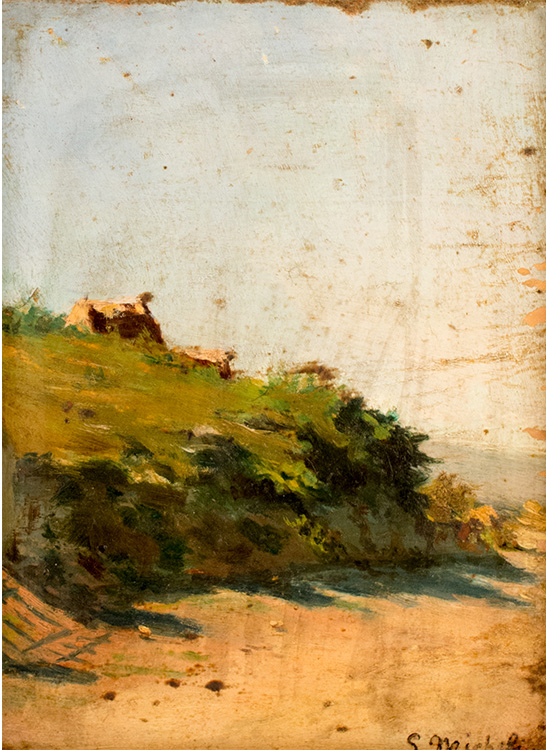 S. Micheli Dipinto raffigurante "Paesaggio". Fine XIX sec. Tempera su tavola; 18,3 x 14,3 cm; firmato in basso a destra "S. Micheli"