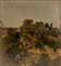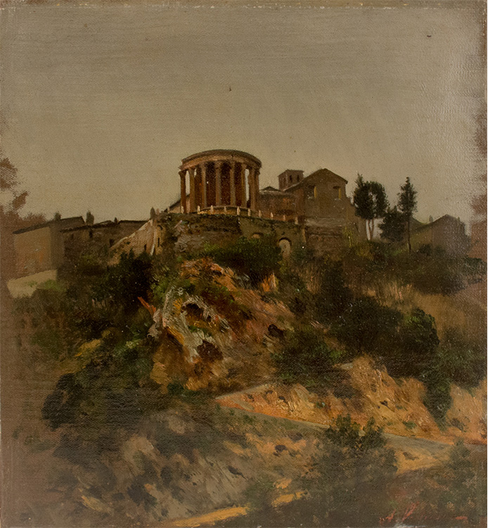 Scuola italiana Dipinto raffigurante "Veduta di campagna romana". XIX sec. Olio su tela; 28 x 25,5 cm; firmato in basso a destra: "A. Datini".