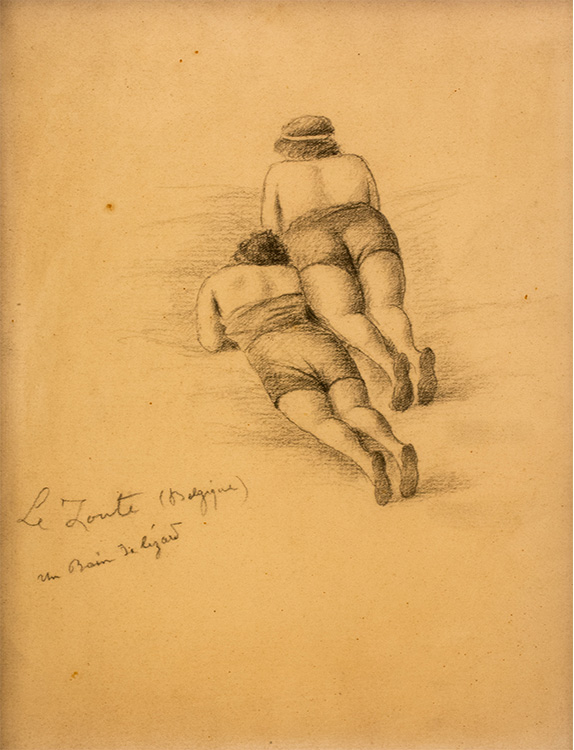 Disegno raffigurante due bagnanti distesi. inizi XX sec. Carboncino su cartone; 27 x 21 cm; firmato "Le Tante Belgique un Bain je légard".