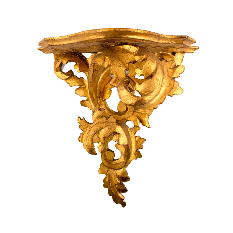 Italia Centrale Coppia di mensoline in legno dorato II metà XVIII sec. Legno dorato con tralci vegetali; 27,5 x 27,5 x 14,5 cm; provenienza: Italia Centrale.