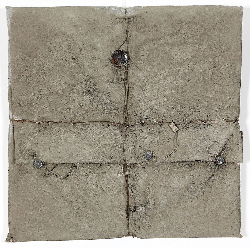 SEBASTIANO BALBO 1956 Il pacco, 2016-17 Tela, cemento e ferro con all’interno un’opera di Antonio Bueno, cm. 42 x 42 Firmato e datato Prov. Collezione dell’artista