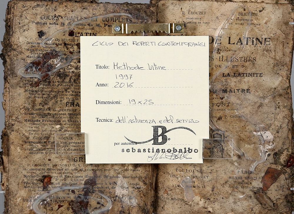 SEBASTIANO BALBO 1956 Methode latine, 1997-2016 Tecnica mista e resina su libro in teca di plexiglass, cm. 19 x 25 Firmato e datato sul retro Timbro Sebastiano Balbo sul retro Prov. Collezione dell’artista